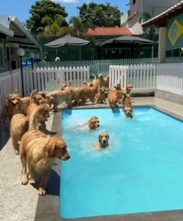 Eles chegam na parte da manhã e vão direto para piscina, nadam sob o olhar de um de nossos monitores que os estimulam com bolinhas e macarrões, depois vão para um de nossos piquetes onde ficam soltos e interagem com outros Goldens correndo, se divertindo e socializando.